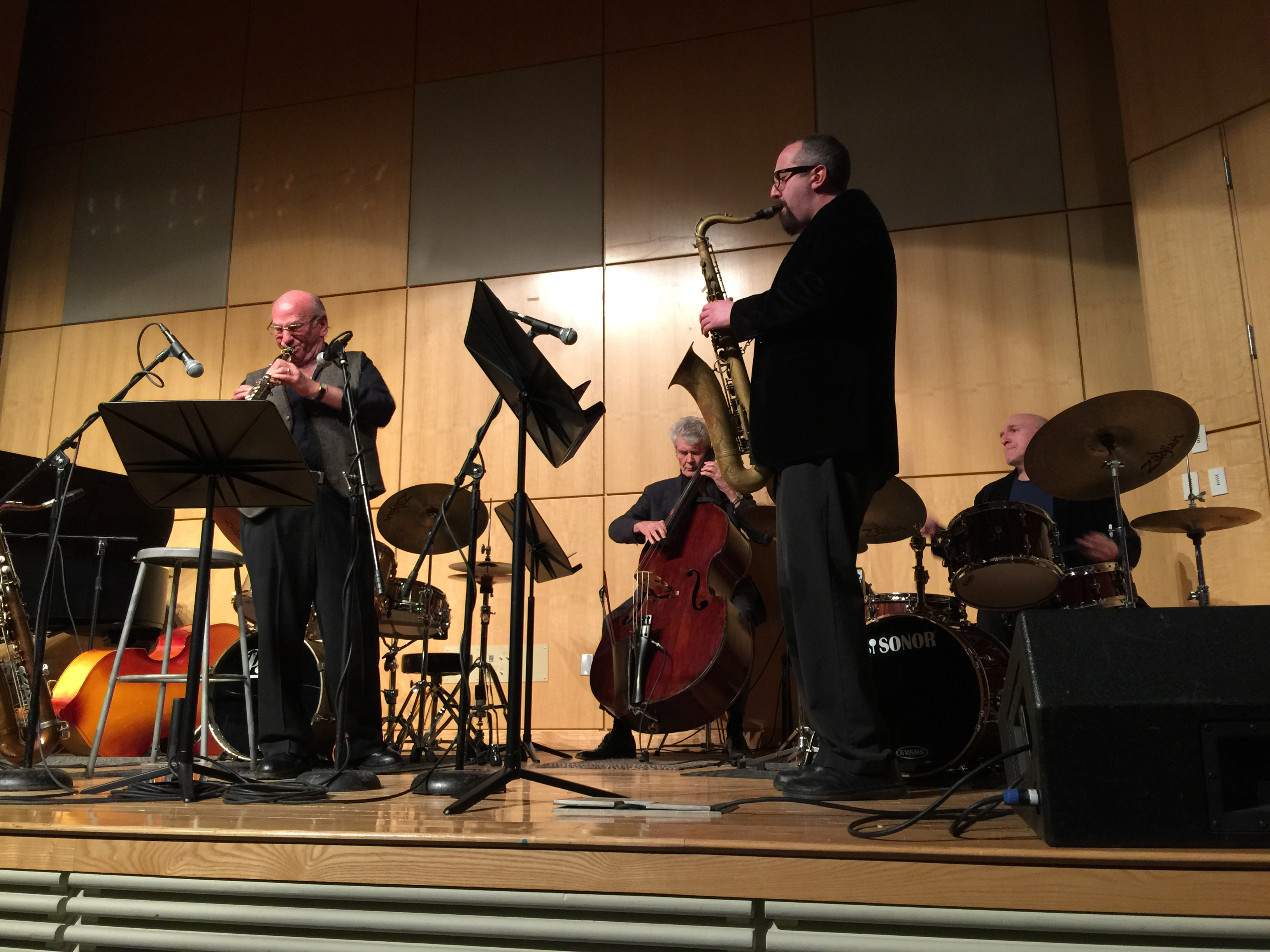 CLARK UNIVERSITY Featuring: David Liebman (saxophone) Adam Niewood (saxophone) Gene Perla (bass) Adam Nussbaum (drums) And joining us for the last tune: Bobby Avey (piano) Ron McClure (bass) Billy Hart (drums) Location: Worcester, MA, US |